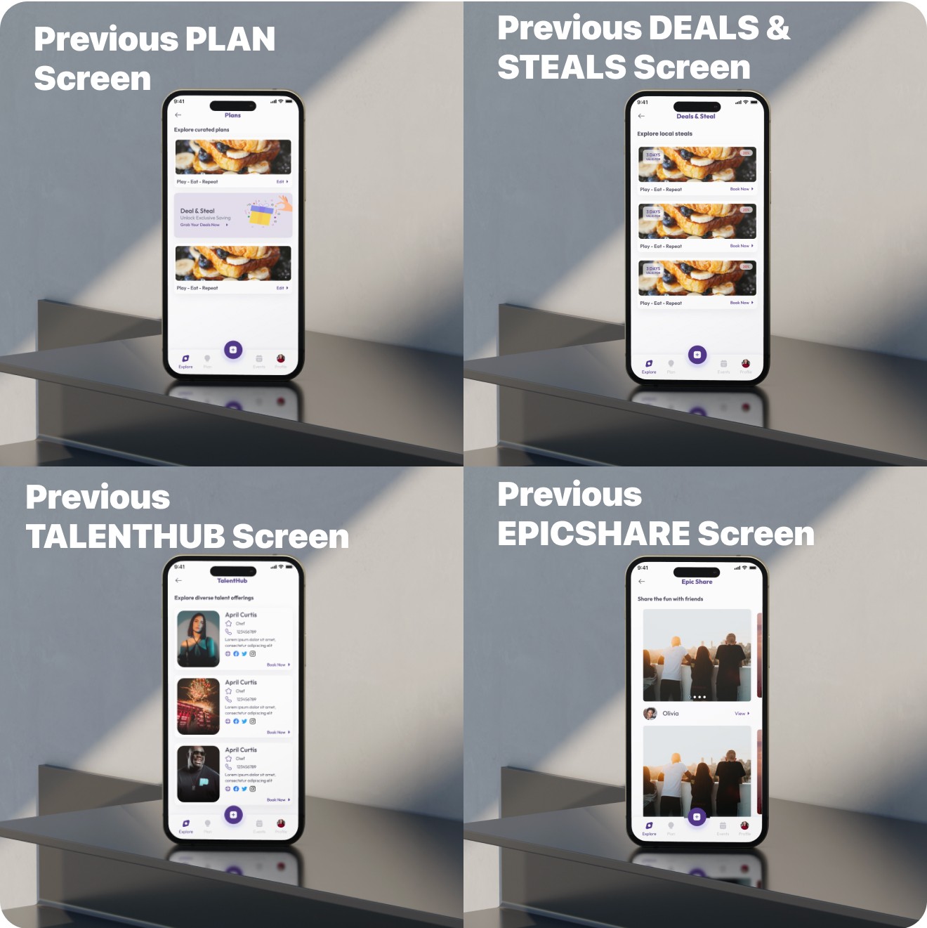 Each feature—Deals and Steal, EpicShare, Plans, and Talent Hub—was given a unique color to differentiate it, while still maintaining the brand’s cohesive feel. This approach allowed users to move effortlessly between sections, while staying engaged and excited.
