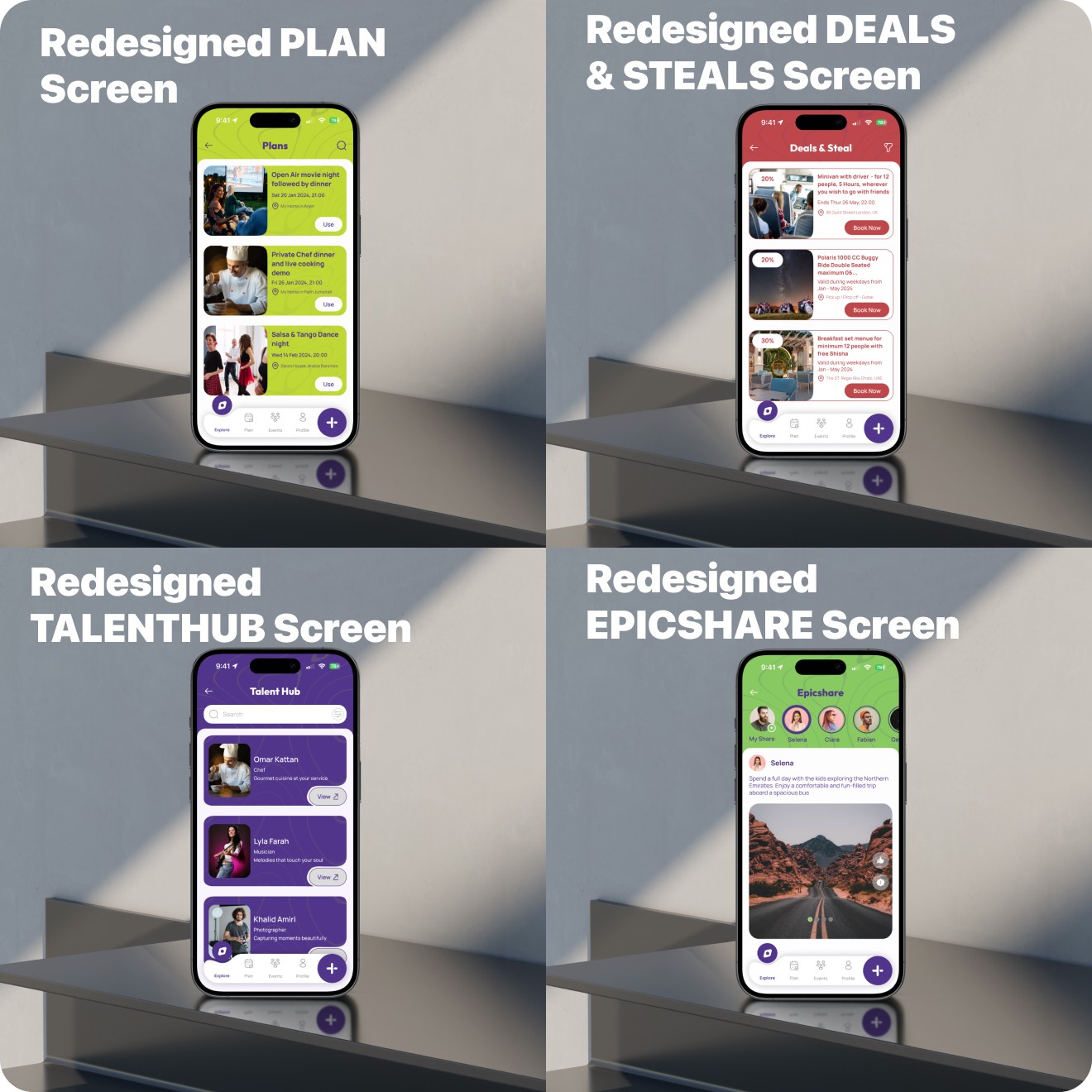 Additionally, the company had four core features that needed their own distinctive flair: Deals and Steal, EpicShare, Plans, and Talent Hub. My mission was to give each feature its own personality while keeping the app’s overall feel cohesive. I represented these key sections using different colors—because, let’s face it, what’s more fun than visual variety? This gave each feature its own vibe, making it easy to distinguish and delightful to use.